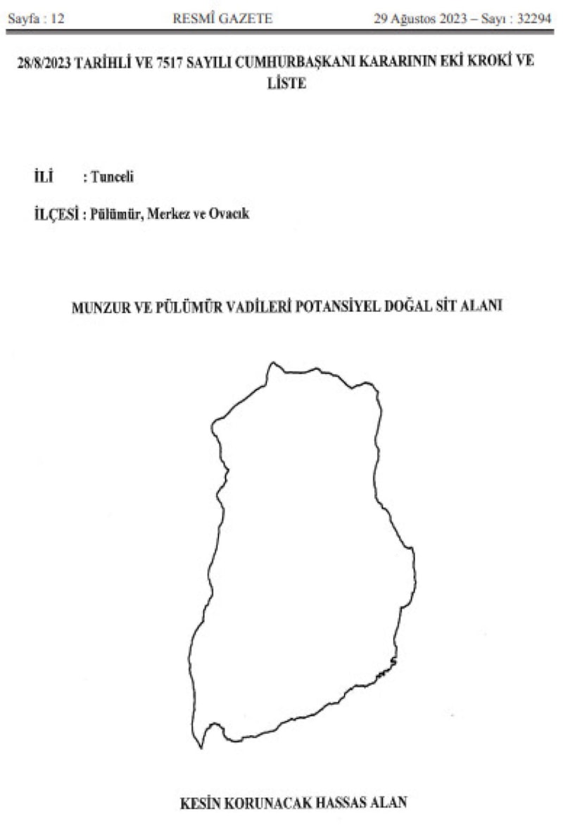 Tunceli ili, Pülümür, Merkez ve Ovacık ilçeleri sınırları içerisinde bulunan Munzur ve Pülümür Vadileri potansiyel doğal sit alanının koruma statüsünün değerlendirilmesi sonucunda, ekli kroki ile listede sınır ve koordinatları gösterilen alanın kesin korunacak hassas alan olarak tescil ve ilan edilmesine, 1 sayılı Cumhurbaşkanlığı Kararnamesi'nin 109’uncu maddesi gereğince karar verilmiştir"