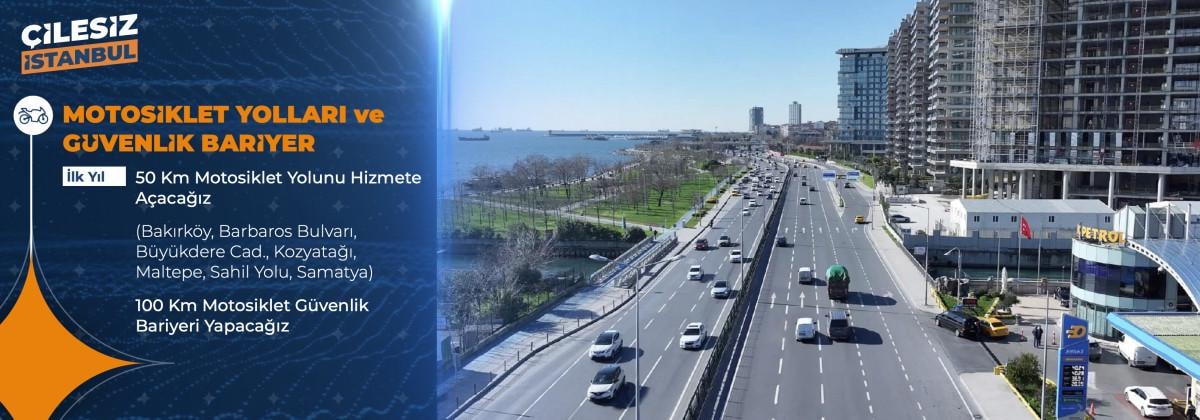 - İlk 1 yılda; 50 km’lik motosiklet yolu hemen hizmete açılacak. (Bakırköy, Barbaros Bulvarı, Büyükdere Caddesi Koz Yatağı Maltepe, Sahil Yolu ve Samatya)