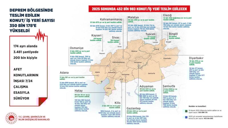 - Çevre, Şehircilik ve İklim Değişikliği Bakanı Murat Kurum, deprem bölgesinde 350 bin 178 bağımsız bölümün teslim edildiğini ve yıl sonunda 452 bin 983'e ulaşacağını açıkladı.