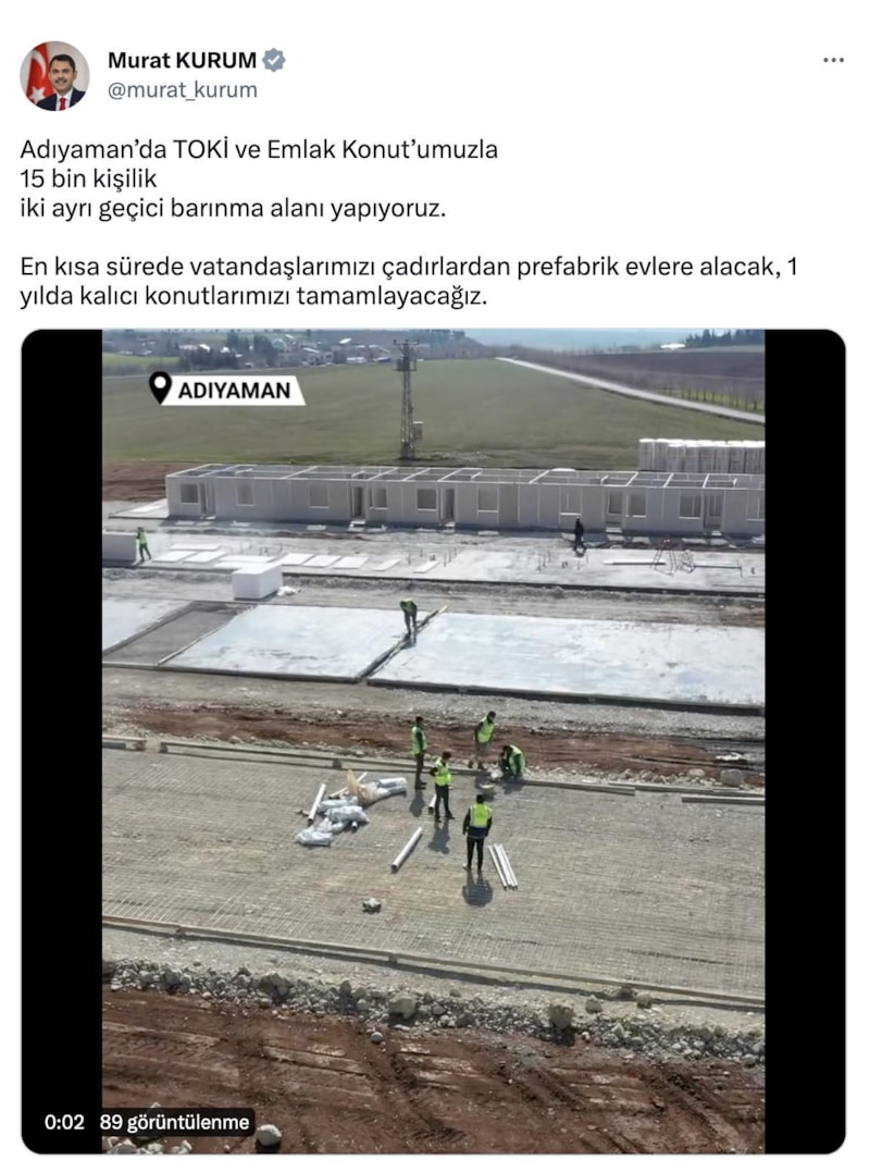 Adıyaman’da TOKİ ve Emlak Konut’umuzla 15 bin kişilik iki ayrı geçici barınma alanı yapıyoruz. En kısa sürede vatandaşlarımızı çadırlardan prefabrik evlere alacak, 1 yılda kalıcı konutlarımızı tamamlayacağız.