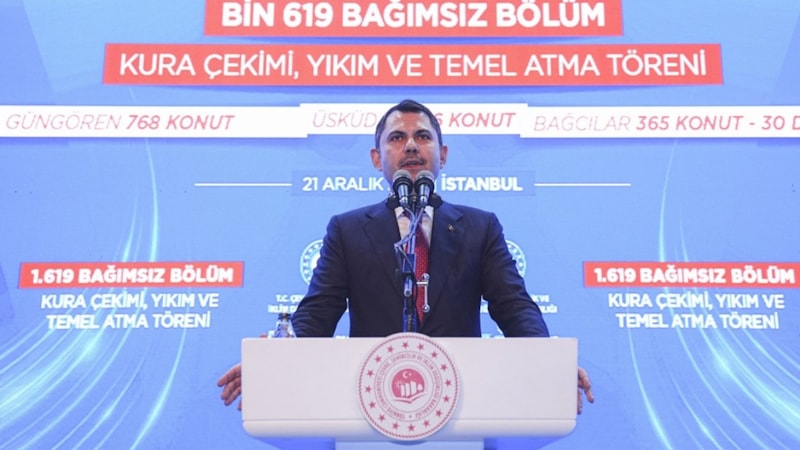 Murat Kurum, Güngören Gösteri Merkezi'nde, kentsel dönüşüm projeleri kapsamında Güngören'de 768 konutun kura çekimi, Üsküdar'da 456 konutun yıkımı ile Bağcılar'da 365 konutun temel atma törenine katıldı.