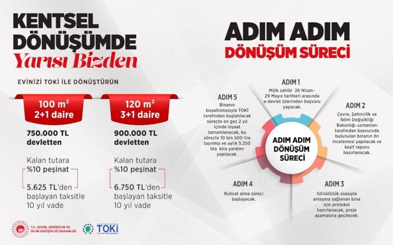 Müjdeyi veren Cumhurbaşkanı Recep Tayyip Erdoğan, dönüşüme giren evlerin maliyetinin yarısını devletin karşılayacağını açıkladı.