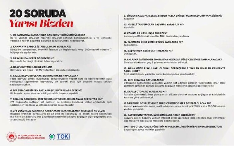 Hem Anadolu Yakası'nda hem Avrupa Yakası'nda uydu kentlerimizi inşa edeceğiz. Kalan 500 bin konutumuzu da yerinde vatandaşlarımızın rızasıyla dönüştürüp İstanbul'umuzda tek bir riskli yapı bırakmayacağız. Yarısı Bizden kampanyamıza bugün başvurular başladı.