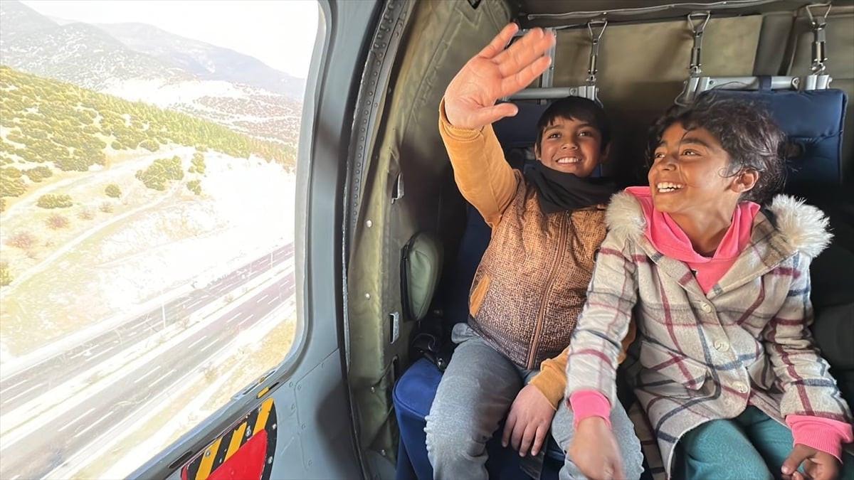 İlk kez helikoptere binmekten duydukları mutluluğu ifade eden, yaşları 7 ile 9 arasında değişen 9 depremzede çocuk, yaklaşık yarım saat Gaziantep'e gökyüzünden bakma fırsatı buldu.