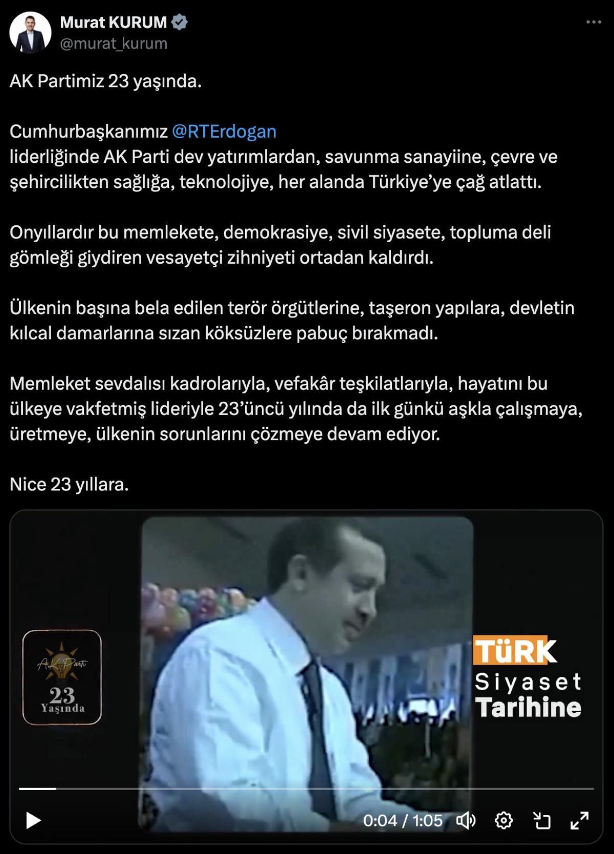 Çevre, Şehircilik ve İklim Değişikliği Bakanı Murat Kurum, Cumhurbaşkanı Recep Tayyip Erdoğan tarafından 2001 yılında kurulan AK Parti'nin 23'üncü kuruluş yıl dönümüne ilişkin sosyal medya hesabından bir video paylaştı.