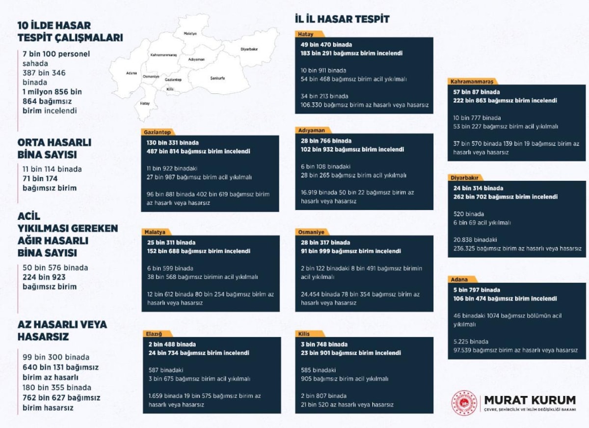 Orta hasarlı bina sayısı 11 bin 114 binada 71 bin 174 bağımsız birim olarak belirlenirken; acil yıkılması gereken ağır hasarlı bina sayısı ise 50 bin 576 binada 224 bin 923 bağımsız birim olarak açıklandı.