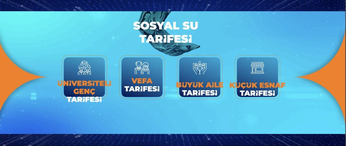Üniversiteli Genç tarifesi, 65+ ve emekli tarifesi, Büyük Aile tarifesi ve Küçük Esnaf tarifesi ile adil su yönetimi hayata geçirilecek.