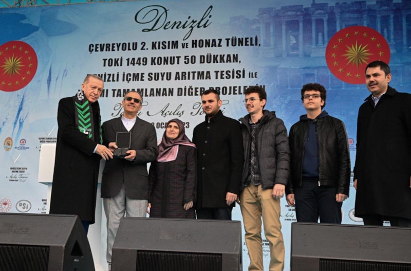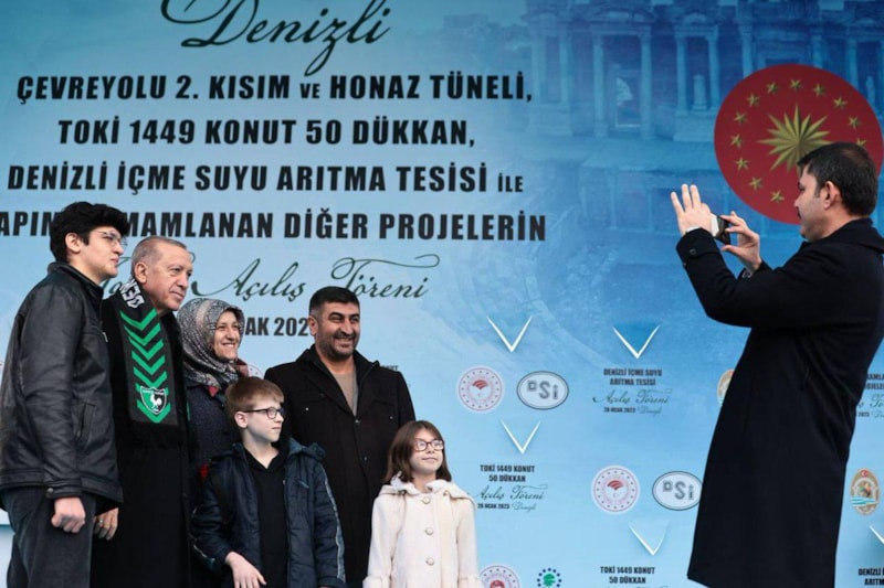Denizli'de konutlarına kavuşan ailelerle Cumhurbaşkanı Erdoğan hatıra fotoğrafı çektirdi. Çevre, Şehircilik ve İklim Değişikliği Bakanı Murat Kurum da o anlarda çektiği fotoğrafı sosyal medyadan paylaştı