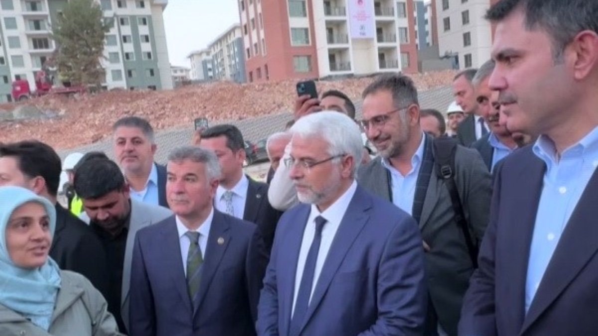 Bakan Murat Kurum şantiye alanını gezerken, yanına Adıyamanlı depremzede Suzan Sarısakal ve eşi Yıldırım Sarısakal geldi.