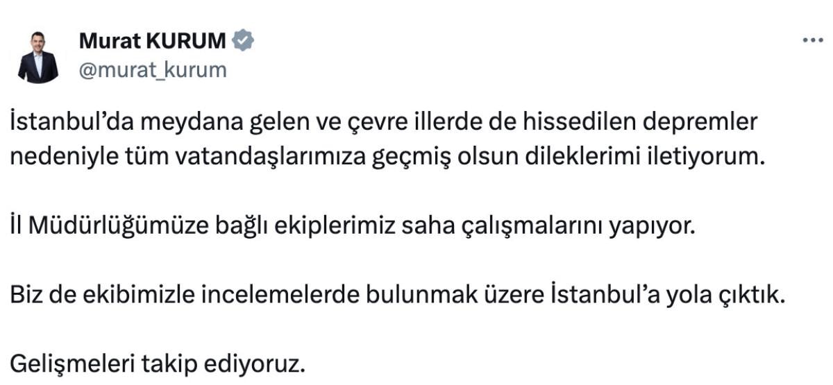 Çevre, Şehircilik ve İklim Değişikliği Bakanı Murat Kurum, İstanbul'da yaşanan deprem sonrası X hesabından bir paylaşım yaptı.