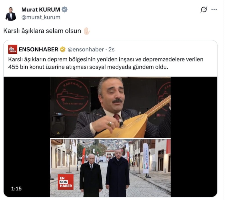 Ensonhaber'in paylaştığı Karslı âşıkların deprem bölgesine ilişkin yaptığı atışmayı Çevre, Şehircilik ve İklim Değişikliği Bakanı Murat Kurum alıntıladı. Kurum paylaşımına, "Karslı âşıklara selam olsun" notunu düştü.