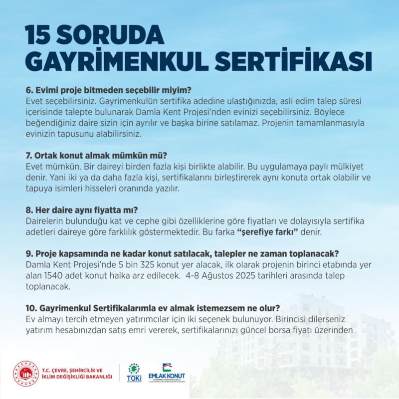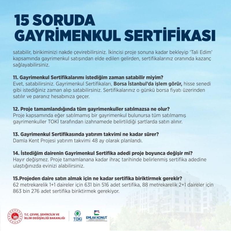 Çevre, Şehircilik ve İklim Değişikliği Bakanı Murat Kurum, kamuoyunda ilgi gören Gayrimenkul Sertifikası modeliyle ilgili merak edilen soruları ve cevaplarını sosyal medya hesabından “Görüyorum ki; dün açıkladığımız küçük birikimlerle ev alma projemize ilgi büyük ve merak edilen birçok konu var. İlk olarak İstanbul’da başlattığımız Gayrimenkul Sertifikasıyla ilgili 15 soru 15 cevap burada.” notuyla paylaştı.