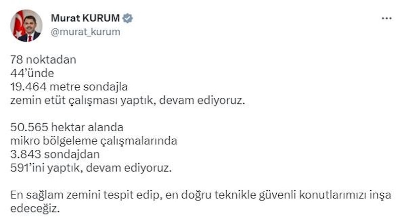 Depremden etkilenen şehirlerin yeniden ayaklanması için yürütülen çalışmalara ilişkin paylaşım yapan Çevre, Şehircilik ve İklim Değişikliği Bakanı Kurum, "Zemin etüt çalışmalarına devam ediyoruz" dedi.