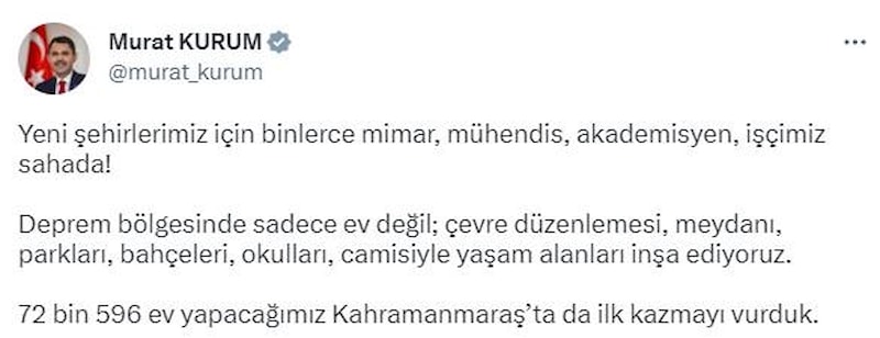 Çevre, Şehircilik ve İklim Bakanı Kurum, sosyal medyada yaptığı paylaşımda depremin merkezi Kahramanmaraş'ta yeni konutlar için çalışmalara başlandığını duyurdu.