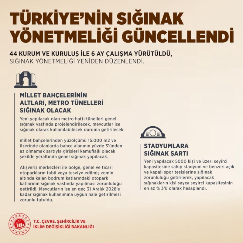 X hesabı üzerinden paylaşım yapan Murat Kurum, "Ülkemizin sığınak yönetmeliğini günümüz ihtiyaç ve koşullarına uygun hale getirerek güncelledik" dedi. Buna göre alışveriş merkezleri, stadyumlar ve miller bahçelerine sığınak yapılacak.