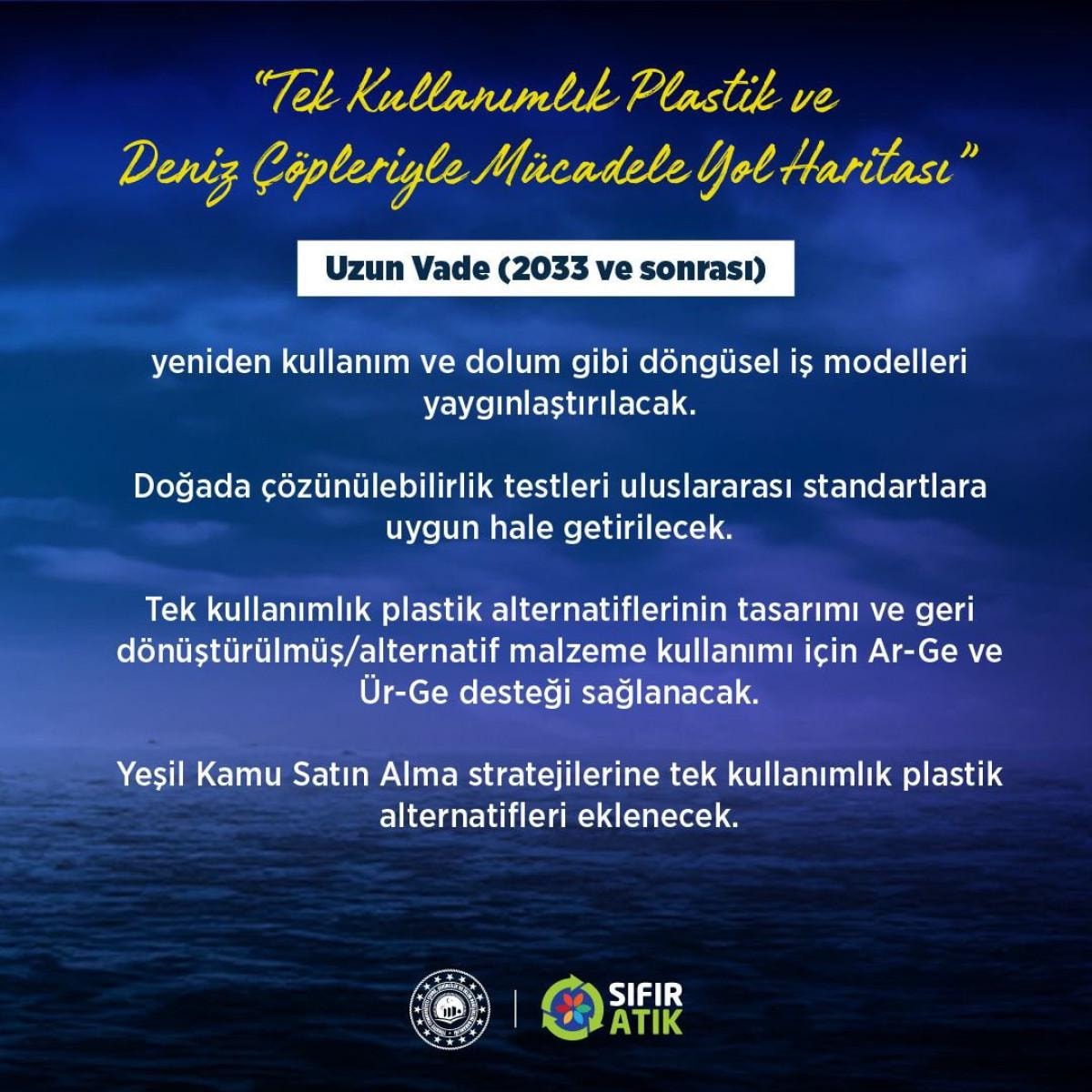 Çevre, Şehircilik ve İklim Değişikliği Bakanlığı, Çevre Yönetimi Genel Müdürlüğü’nün literatür taramaları, kamu ve özel sektör temsilcilerinin katkılarının alındığı çalıştaylar, kurumsal anket ve TÜİK tarafından gerçekleştirilen kamuoyu anketi sonuçlarına dayanarak, hazırladığı ‘Tek Kullanımlık Plastikler, Deniz Çöpleri ve Mikroplastikler Yol Haritası"nda 22 kamu kurum ve kuruluşu kapsayacak, 44 eylem yer aldı.