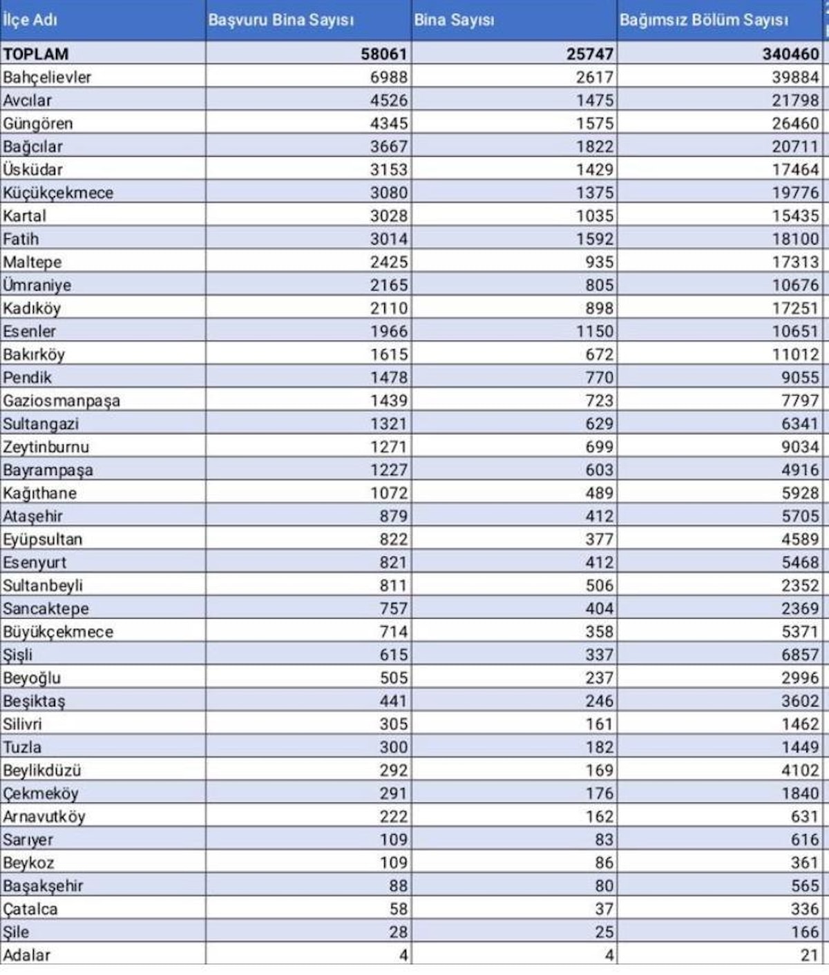 - Bahçelievler: Başvuru bina sayısı: 6 bin 988 / Bina sayısı: 2 bin 617 / Bağımsız birim sayısı: 39 bin 884