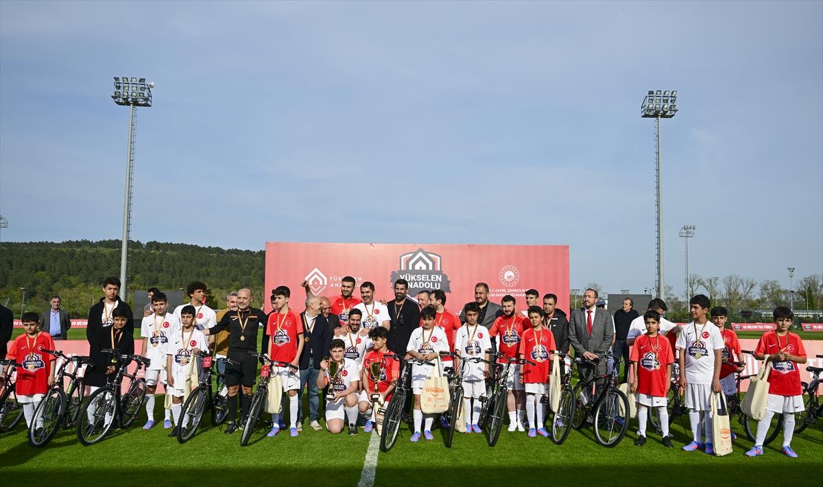 Depremzede çocuklar, kupalarını ve hediyelerini Bakan Kurum'un elinden aldı.
