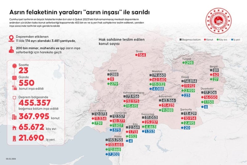 Cumhuriyet tarihinin en büyük felaketlerinden biri olan 6 Şubat 2023'teki Kahramanmaraş merkezli depremlerin ardından yürütülen kalıcı konut seferberliği kapsamında 455 bin ev ve iş yeri hak sahiplerine teslim edilerek, yeniden inşa sürecinde tarihi bir eşik geride bırakıldı.