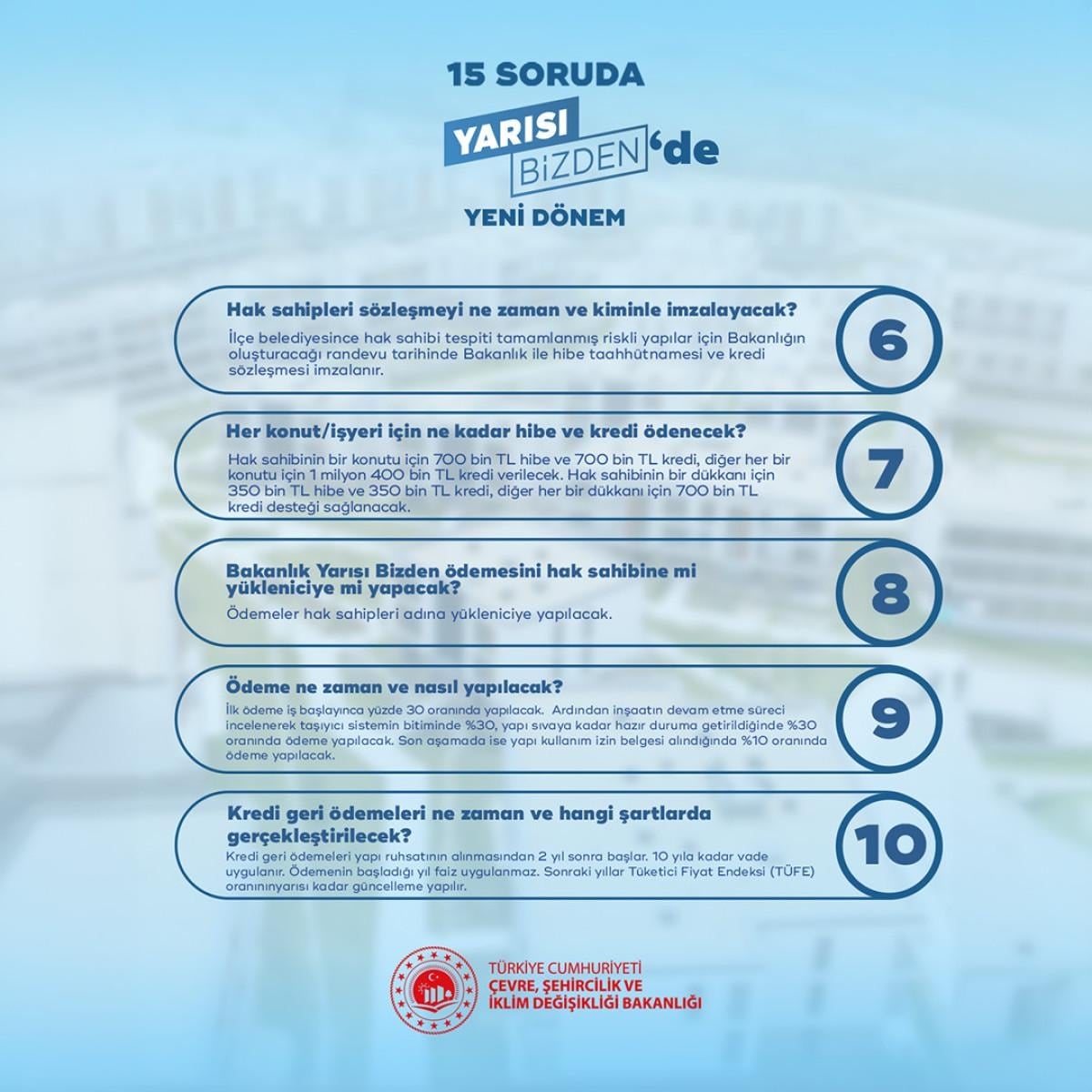 Vatandaşların merak ettiği sorulara yanıt veren bilgilerin bulunduğu paylaşımda sürecin detayları yer aldı. Bakan Kurum paylaşımında, “Her bir vatandaşımızı sağlıksız konutlardan çıkarana kadar bize durmak yok. İstanbul’da Yarısı Bizden’de yeni dönemi başlattık. İşte merak ettiğiniz soruların yanıtları” ifadesini kullandı.