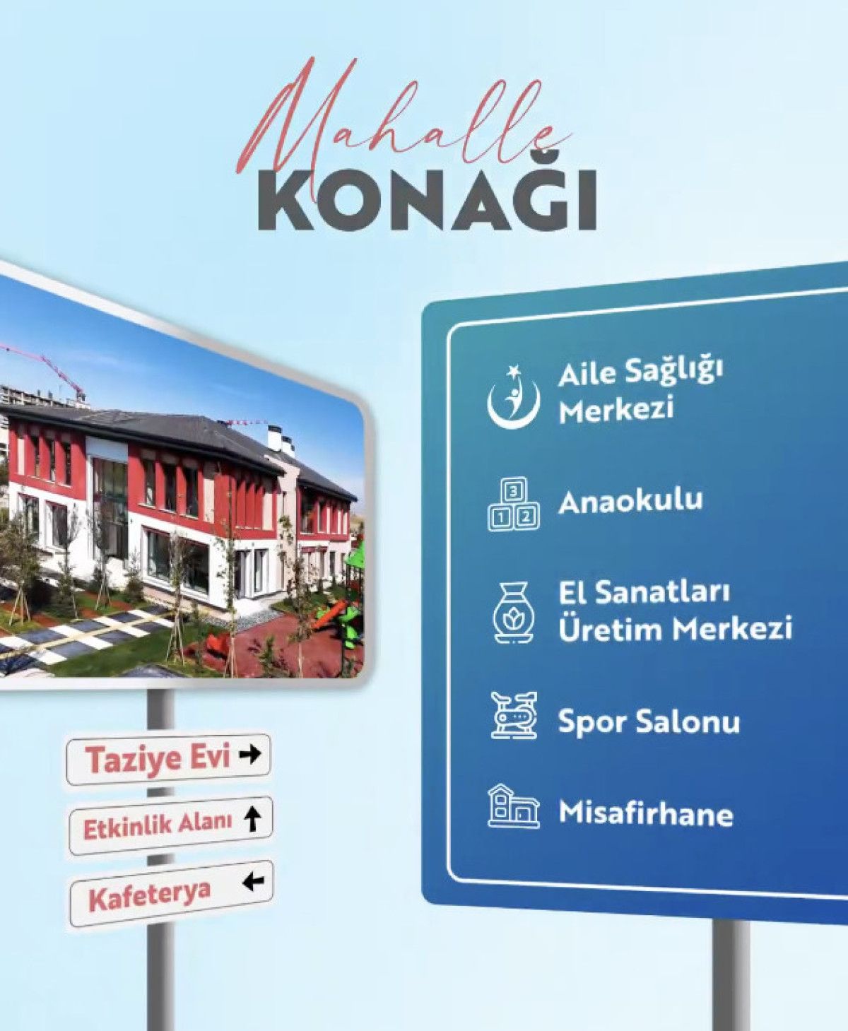 Mahalle konaklarında taziye evi, yaşlılar etkinlik alanı, kafeterya, aile sağlığı merkezi, anaokulu, el sanatları üretim merkezi, spor salonu ve misafirhane bulunacağı belirtildi.