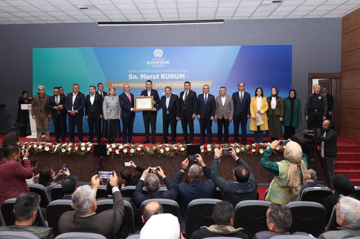 Büyükşehir Belediye Başkanı Sami Er’in takdim ettiği hemşehrilik beratını alan Bakan Kurum, "Malatyalı kardeşlerimizin elinden fahri hemşehrilik beratını almanın, Battal Gazi’nin, merhum Cumhurbaşkanımız Turgut Özal’ın hemşerisi olmanın gururunu, heyecanını, mutluluğunu yaşıyorum. Ben bu onuru bize layık gören Malatyalılara, çok teşekkür ediyorum" dedi.
