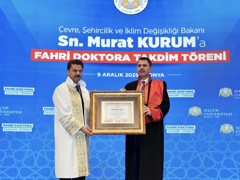 Çevre, Şehircilik ve İklim Değişikliği Bakanı Murat Kurum, mezun olduğu Selçuk Üniversitesi'nden fahri doktora ünvanı aldı. Törende konuşan Bakan Kurum, Türkiye'nin 2026 yılında COP31'e ev sahipliği yapacağı bilgisini de paylaştı.