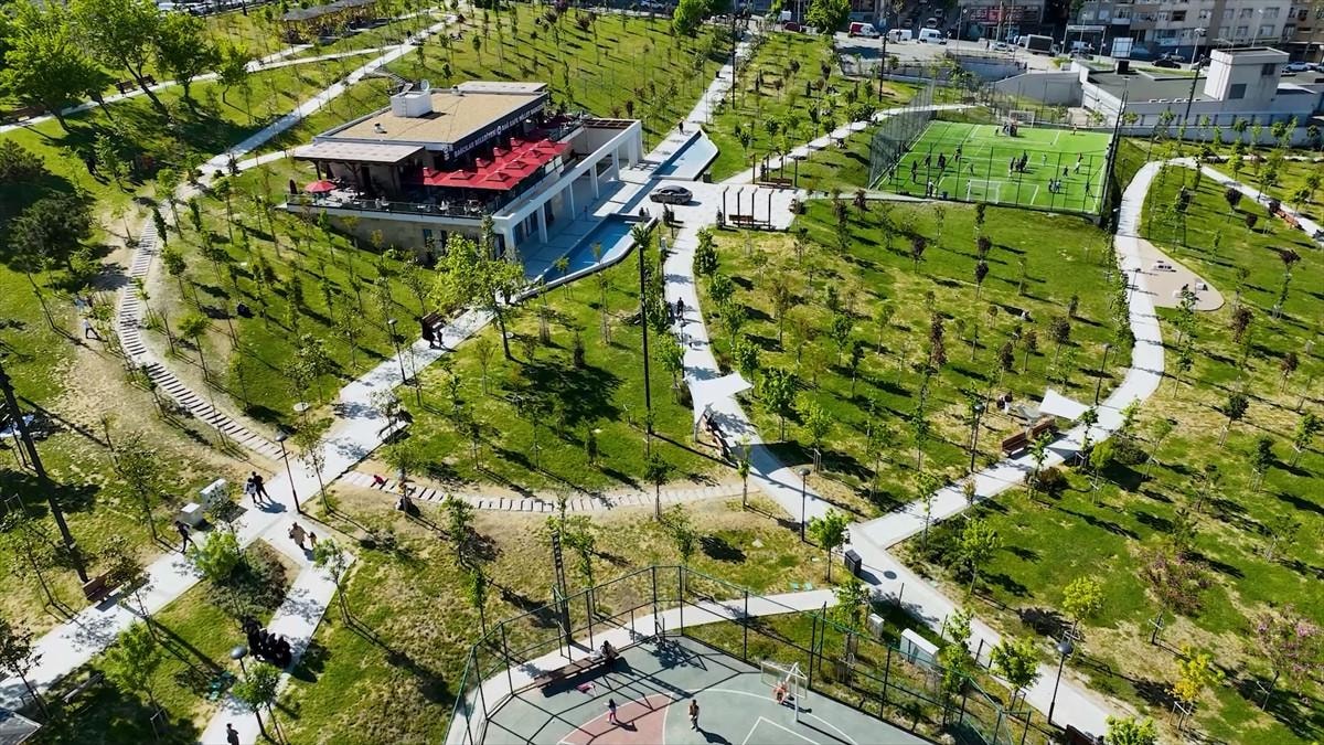 Millet bahçesinde farklı türde 2 bin 30 ağaç, yürüyüş yolları, kafeterya ve spor alanları, sosyal donatılar, basketbol sahası, otopark ve kütüphane bulunuyor.