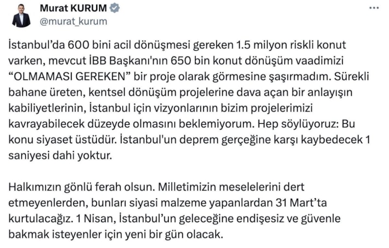 İstanbul’da 600 bini acil dönüşmesi gereken 1.5 milyon riskli konut varken, mevcut İBB Başkanı'nın 650 bin konut dönüşüm vaadimizi “OLMAMASI GEREKEN” bir proje olarak görmesine şaşırmadım. Sürekli bahane üreten, kentsel dönüşüm projelerine dava açan bir anlayışın kabiliyetlerinin, İstanbul için vizyonlarının bizim projelerimizi kavrayabilecek düzeyde olmasını beklemiyorum. Hep söylüyoruz: Bu konu siyaset üstüdür. İstanbul'un deprem gerçeğine karşı kaybedecek 1 saniyesi dahi yoktur.