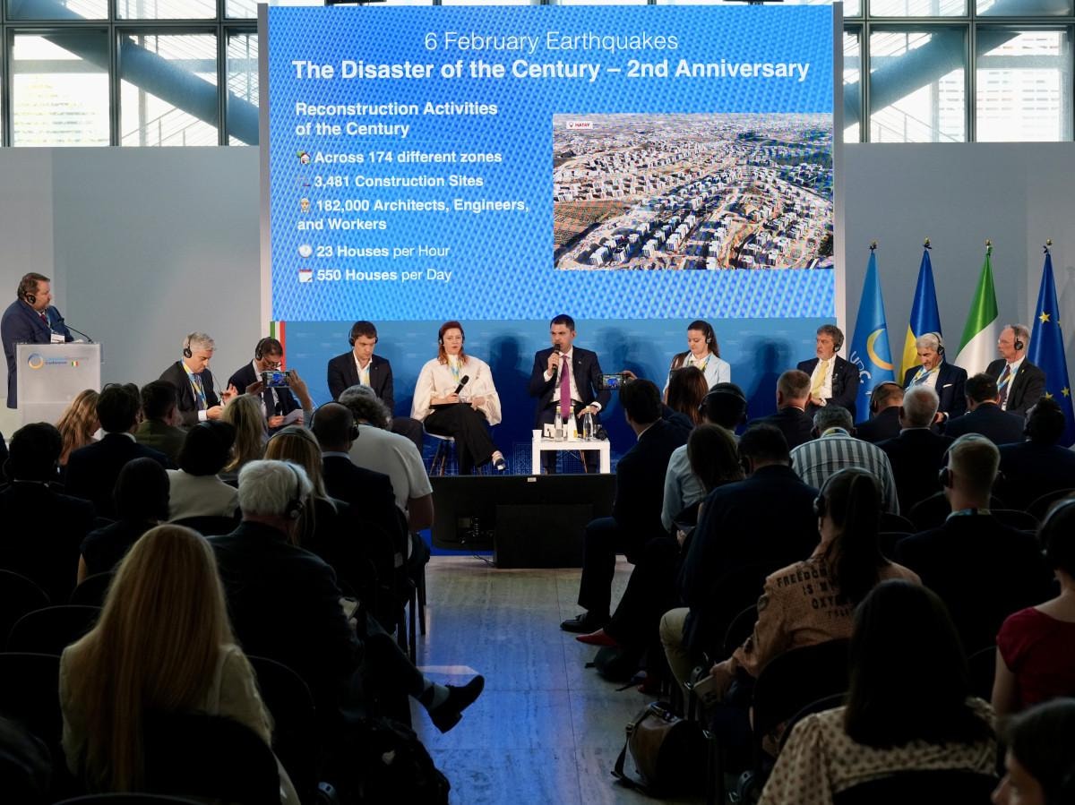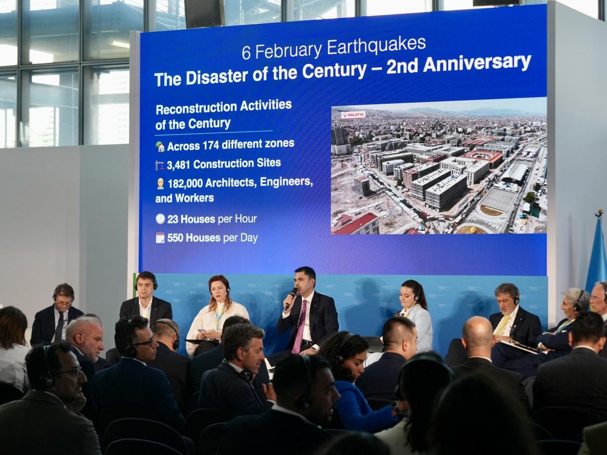 Bakan Kurum, aralarında İtalya, Almanya, Ukrayna ve Polonya gibi ülkelerin temsilcilerinin de olduğu panelde 11 ilde inşa edilen yeni afet konutlarının görüntülerinin, altyapı çalışmalarına ilişkin verilerin ve mühendislik gücünün İngilizce tanıtım filmi eşliğinde sunum yaptı.