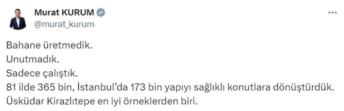 İstanbul'da 31 Mart belediye seçimi çalışmalarını sürdüren Kurum, X hesabından yaptığı paylaşımda, Üsküdar Kirazlıtepe'de öncülük ettiği projelerden örnek verdi.