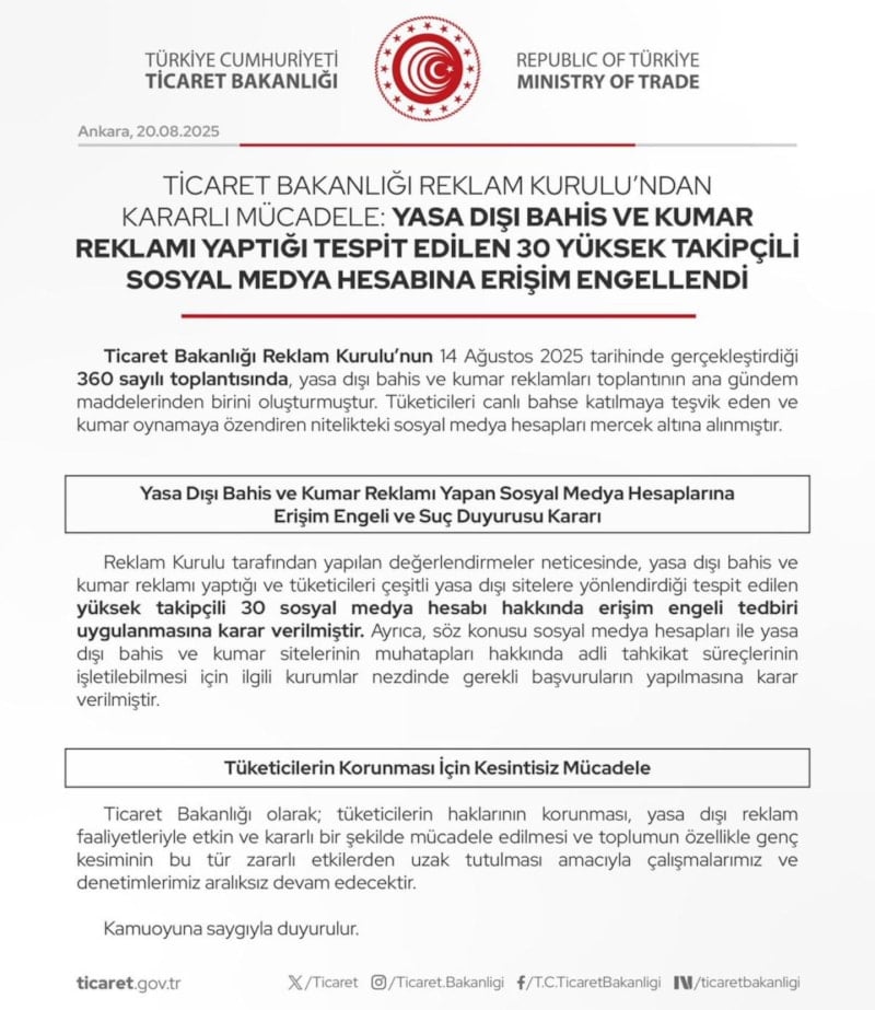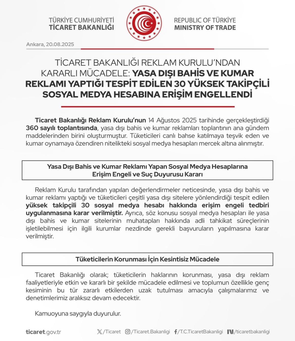 Bakanlıktan yapılan açıklamada, "Reklam Kurulu tarafından yapılan değerlendirmeler neticesinde, yasa dışı bahis ve kumar reklamı yaptığı ve tüketicileri çeşitli yasa dışı sitelere yönlendirdiği tespit edilen yüksek takipçili 30 sosyal medya hesabı hakkında erişim engeli tedbiri uygulanmasına karar verilmiştir." denildi.