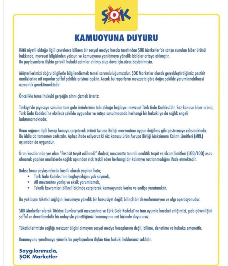 ŞOK Marketler tarafından yapılan açıklamada, söz konusu ürünün, mevzuatta tanımlı analitik tespit ve ölçüm limitleri (LOD/LOQ) esas alınarak analizlerinin yapıldığı, sağlık açısından risk teşkil eden herhangi bir kalıntıya rastlanmadığı ifade edildi.