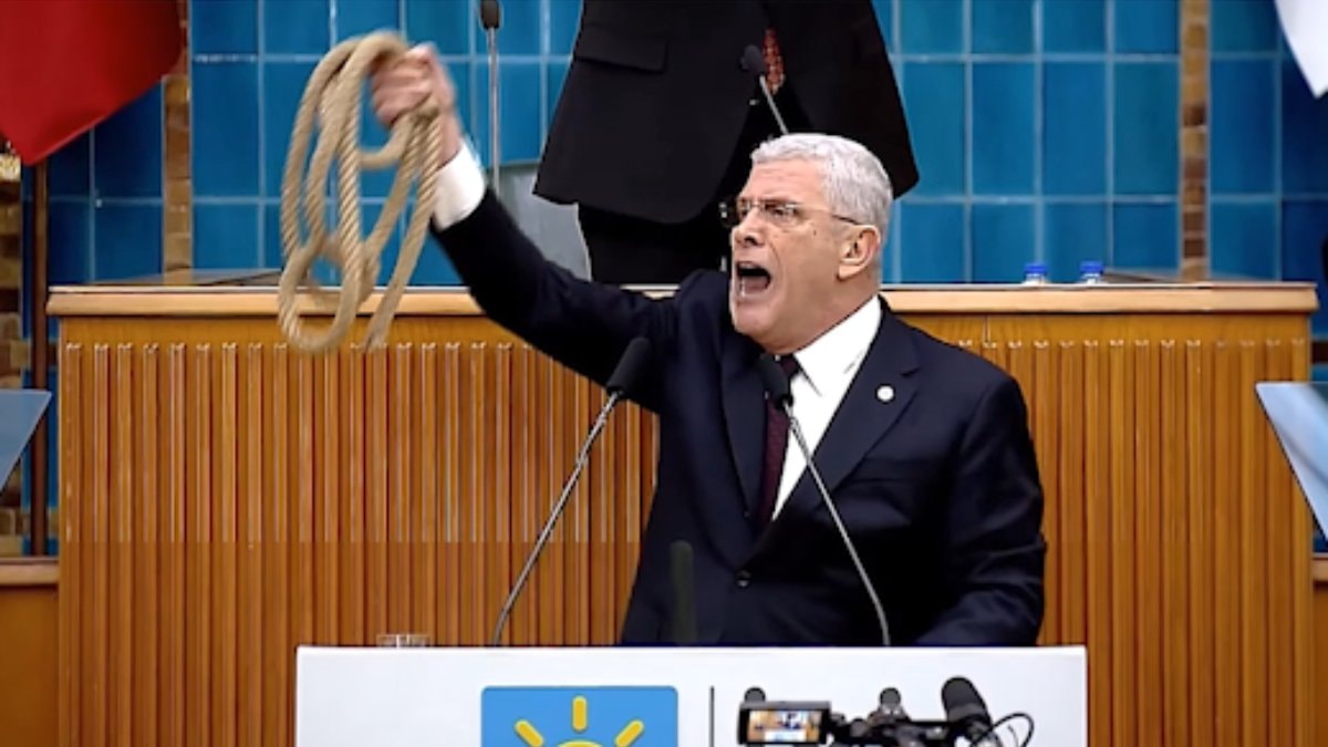 İyi Parti'nin TBMM'deki grup toplantısında Genel Başkan Müsavat Dervişoğlu, eline aldığı urganı sallayıp, "Bu büyük milletin anılarını yok ettiniz. Bu büyük milletin geleceğini katlettiniz. Al şimdi bu ipi baş köşede başının ucuna as" ifadelerini kullandı.