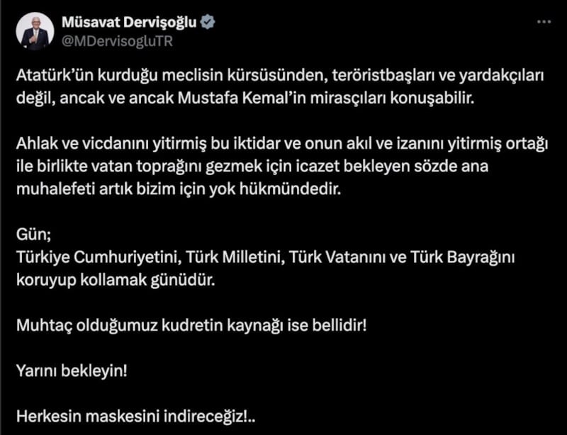 İyi Parti Genel Başkanı Müsavat Dervişoğlu, MHP Lideri Devlet Bahçeli’nin Abdullah Öcalan'a yönelik çağrısına tepki göstererek "Ahlak ve vicdanını yitirmiş bu iktidar ve onun akıl ve izanını yitirmiş ortağı ile birlikte vatan toprağını gezmek için icazet bekleyen sözde ana muhalefeti artık bizim için yok hükmündedir" ifadesinde bulundu.