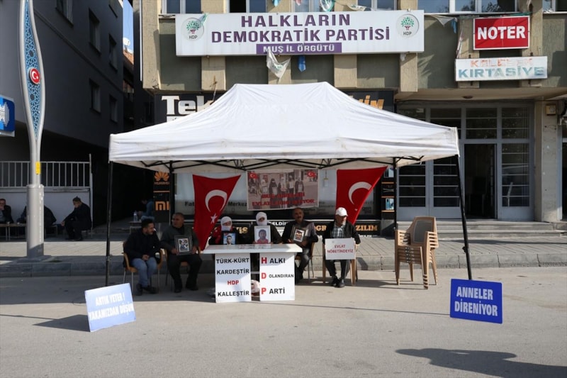 Muş'ta çocuklarına kavuşma ümidiyle her hafta çarşamba günü yaptıkları eylemi bu hafta da sürdüren aileler, HDP İl Başkanlığı binası önünde bir araya geldi.
