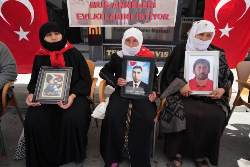 Çocuklarına kavuşma ümidiyle her hafta çarşamba günü DEM Parti il binası önünde bir araya gelen aileler, "Anneler direniyor" ve "Yeter artık evlatlarımızı bırakın" pankartları açtı.
