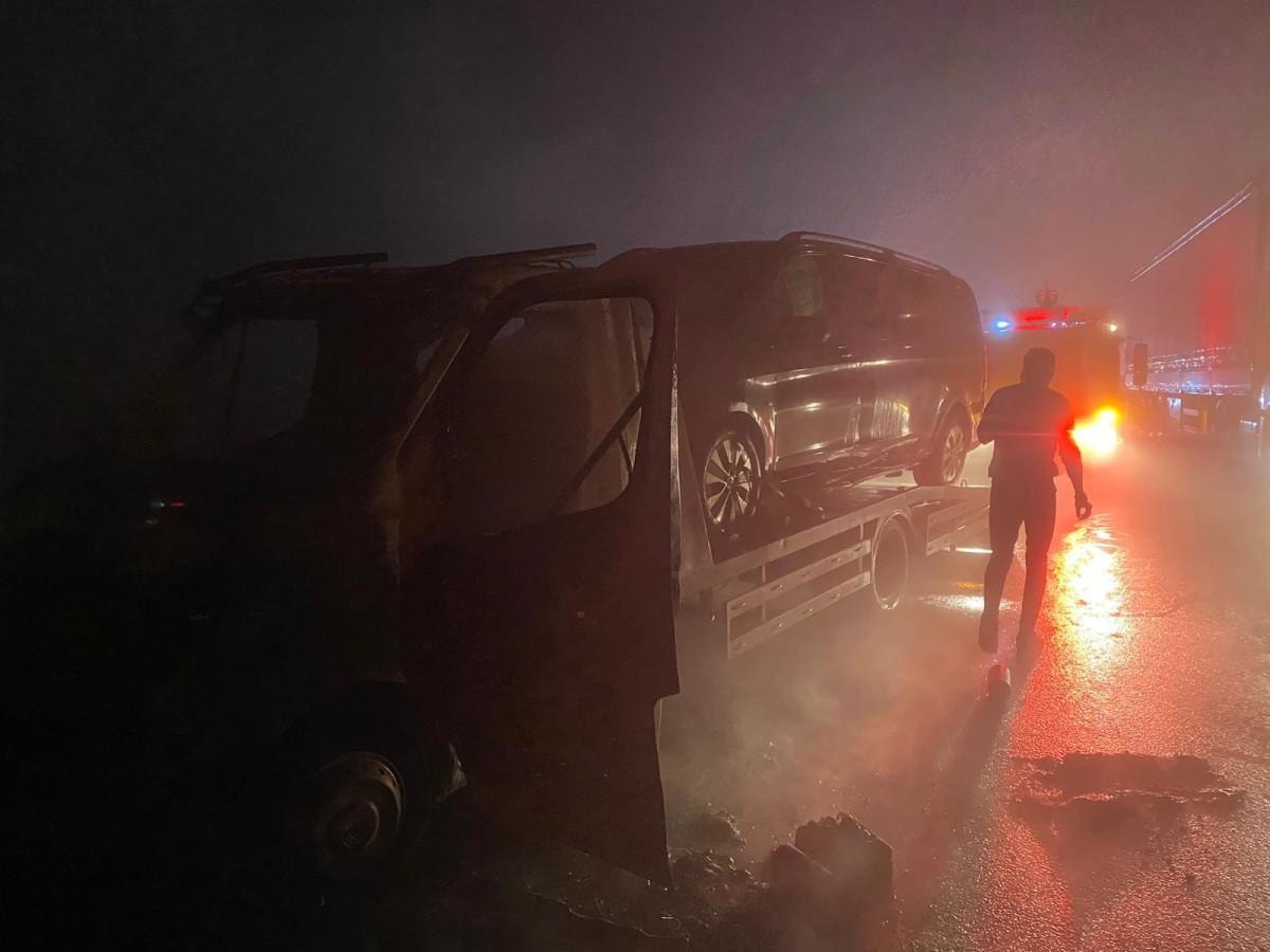 Sürücü yangını yaralanmadan atlatırken yanan çekici ve üstündeki araç, inceleme yapılmak üzere parka çekildi.