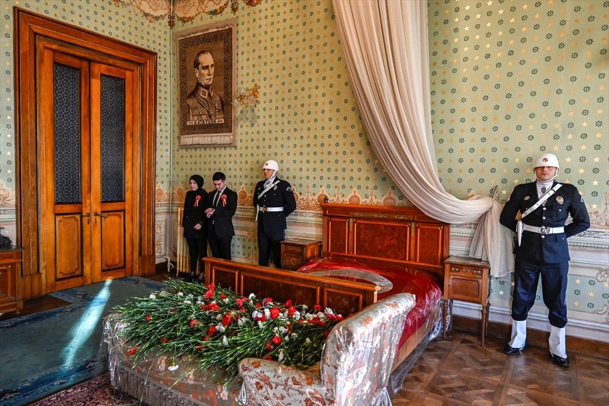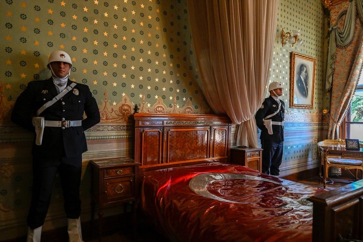 Mustafa Kemal Atatürk'ün 10 Kasım 1938'de yaşamını yitirdiği Türk bayrağı örtülü yatağının iki yanında, iki polis memuru saygı nöbeti tuttu.