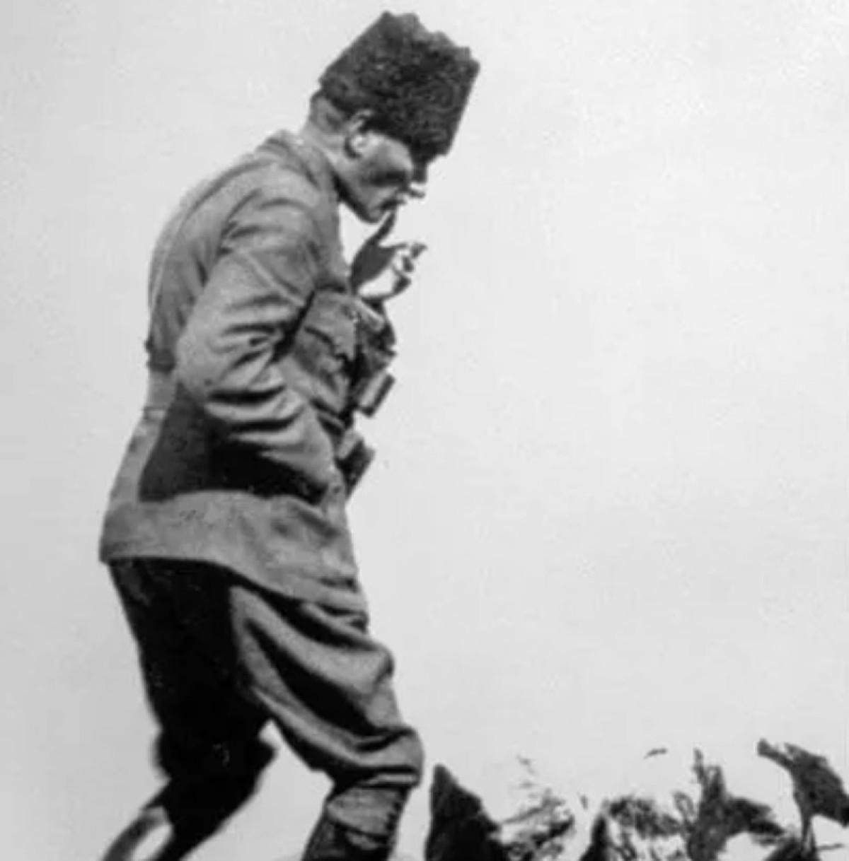 O sabah Kocatepe’deydik. Taarruz, şafak vakti saat beşte başlamıştı. Mustafa Kemal Paşa, günler ve geceler süren yorgunluğuna rağmen ayakta, vaziyeti adım adım takip ediyor, direktifler veriyordu. Bir ara kumandanlardan ayrıldı. Tek başına, kayalıklar arasında dalgın ve düşünceli dolaşmaya başladı. Zaman zaman sahra dürbünleriyle düşman cephesine bakıyordu. Bir ara o kayalık tepenin ucuna geldi. Hafifçe eğilmişti. Başparmağı dudaklarının arasındaydı. Hemen objektifimi çevirdim, adeta nefes almayacak kadar sessizce deklanşöre bastım, resmini çektim.