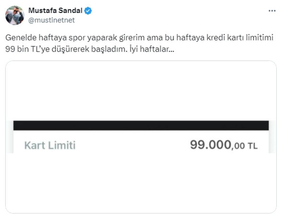 Sandal, yaptığı paylaşımda kredi kartının limitini düşürdüğünü belirterek şu ifadeleri kullandı;