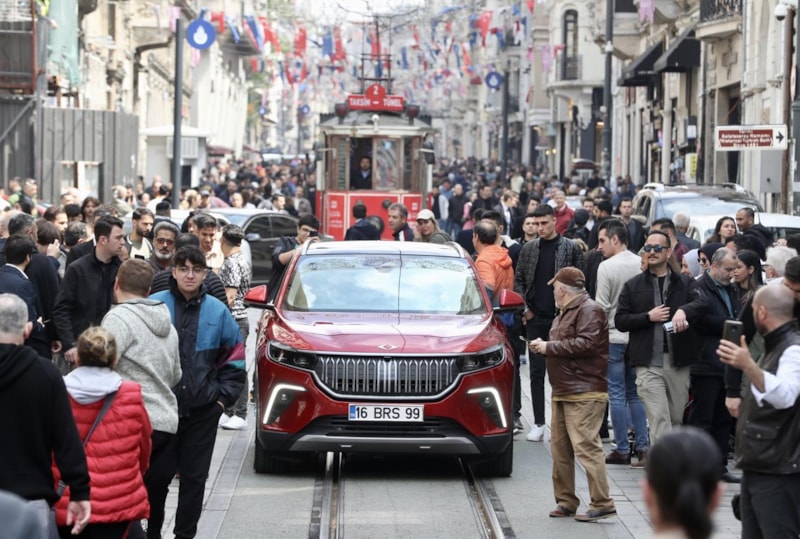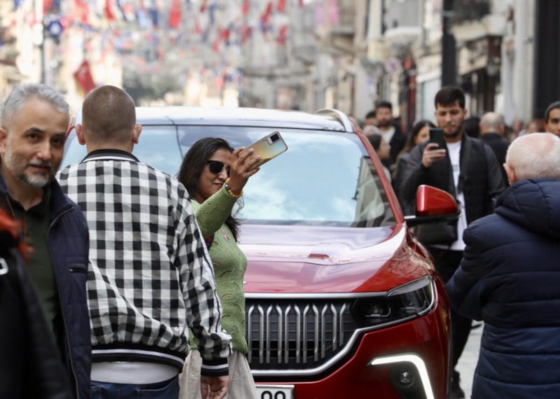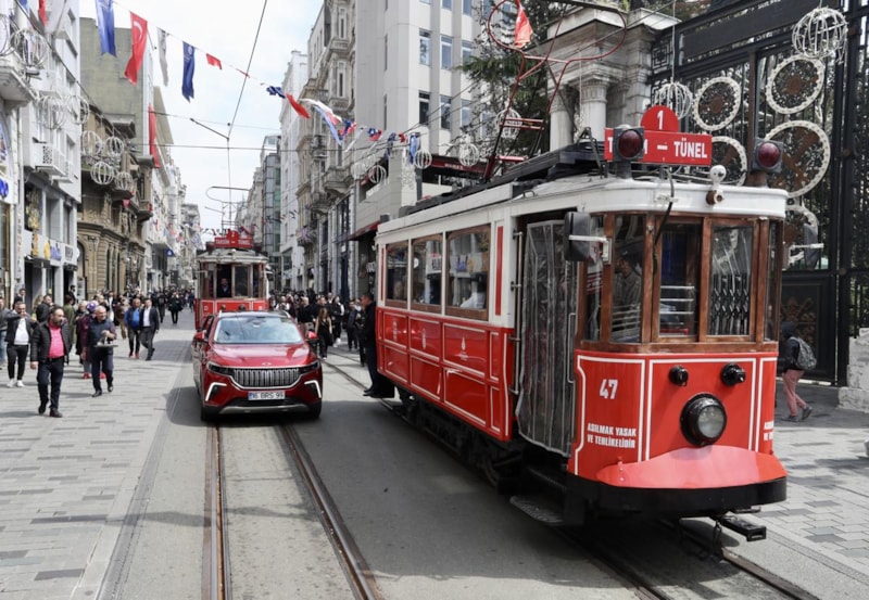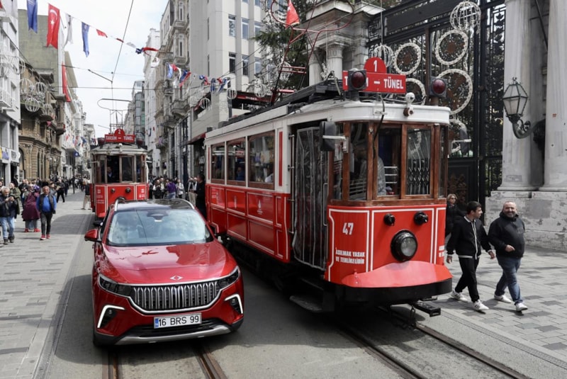İstiklal Caddesi’nin kırmızı renkli nostaljik tramvayının güzergahı da bir süre Anadolu rengi Togg’un rotasında yer aldı.
