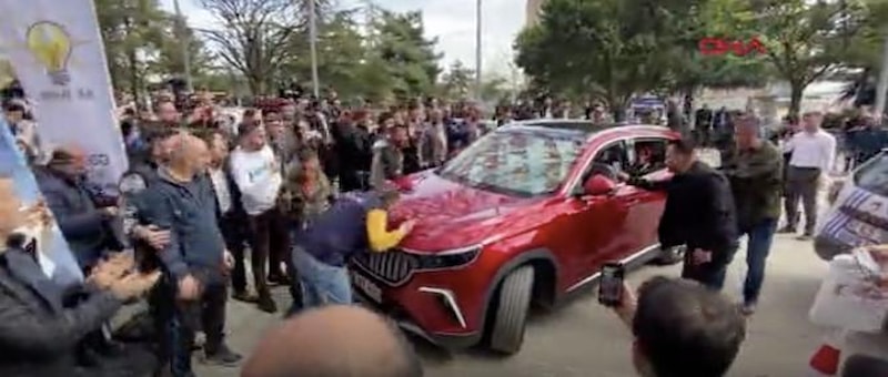 Bakan Varank'ın kullandığı Togg'un önüne atlayan iki kişi Togg'un kaputunu öptü.