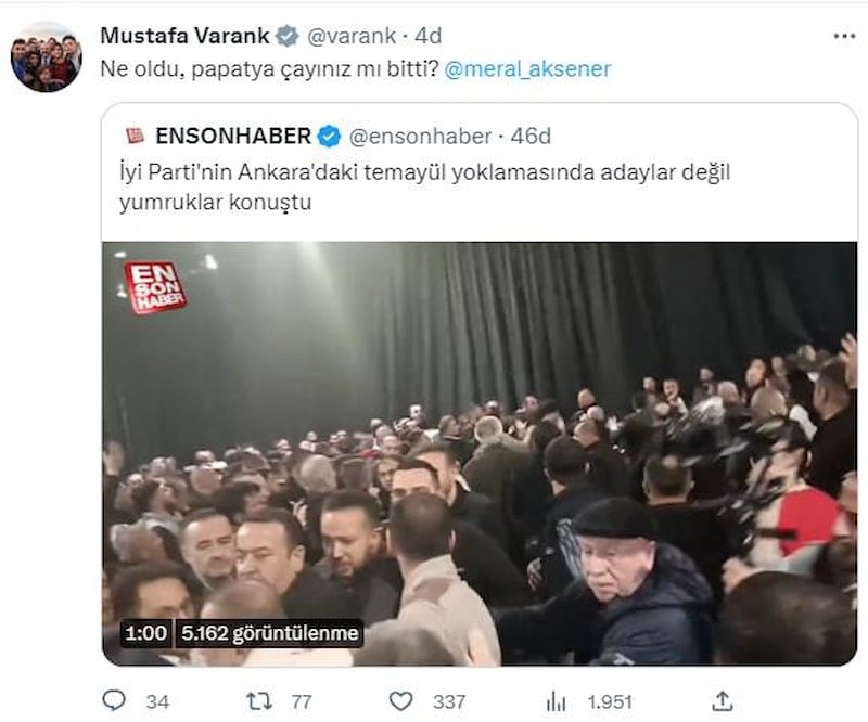 İyi Parti'nin Ankara'da düzenlediği milletvekilliği ön seçiminde partililer arasında yumruk yumruğa kavga çıktı. Sanayi ve Teknoloji Bakanı Mustafa Varank, kavganın görüntüsünü paylaşarak "Ne oldu papatya çayınız mı bitti Meral Akşener" dedi.