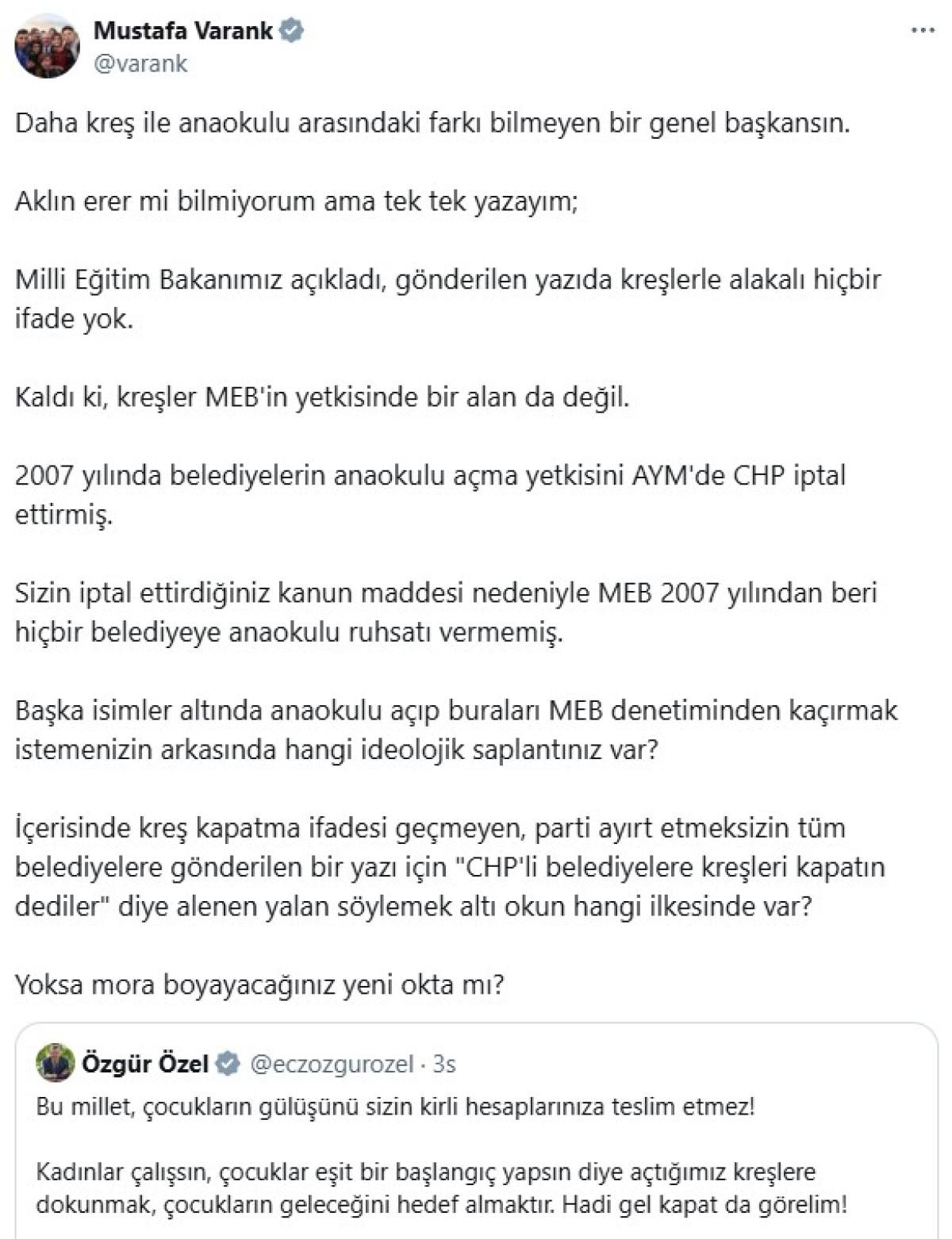 Milli Eğitim Bakanımız açıkladı, gönderilen yazıda kreşlerle alakalı hiçbir ifade yok. Kaldı ki, kreşler MEB'in yetkisinde bir alan da değil. 2007 yılında belediyelerin anaokulu açma yetkisini AYM'de CHP iptal ettirmiş. Sizin iptal ettirdiğiniz kanun maddesi nedeniyle MEB 2007 yılından beri hiçbir belediyeye anaokulu ruhsatı vermemiş.