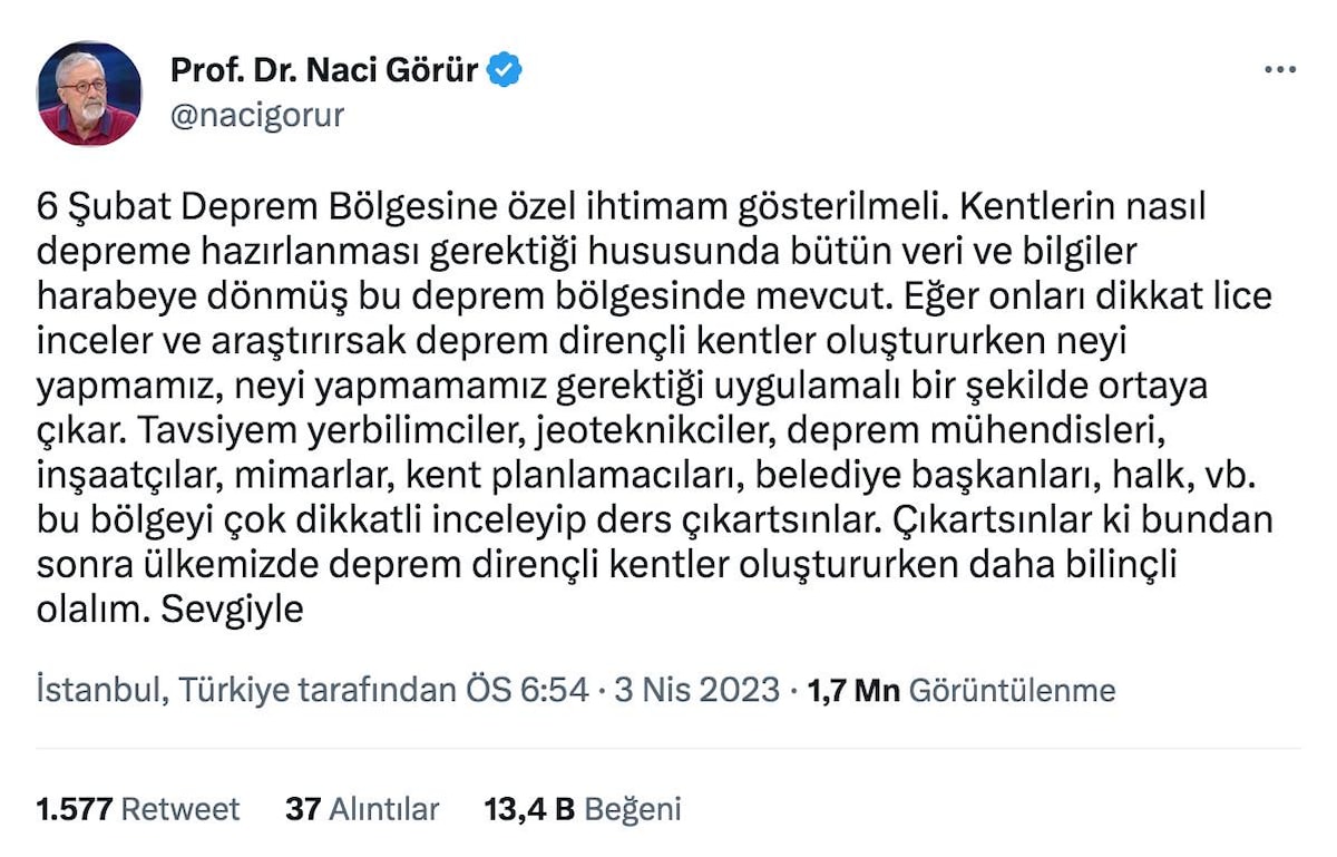Prof. Dr. Naci Görür sosyal medya hesabından dün yaptığı bir paylaşım ile 6 Şubat 2023 tarihinde meydana gelen depremden etkilenen bölgelere özel ihtimam gösterilmesi gerektiğini söyledi.
