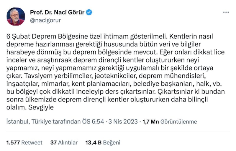 "6 Şubat deprem Bölgesine özel ihtimam gösterilmeli. Kentlerin nasıl depreme hazırlanması gerektiği hususunda bütün veri ve bilgiler harabeye dönmüş bu deprem bölgesinde mevcut. Eğer onları dikkat lice inceler ve araştırırsak deprem dirençli kentler oluştururken neyi yapmamız, neyi yapmamamız gerektiği uygulamalı bir şekilde ortaya çıkar. Tavsiyem yerbilimciler, jeoteknikciler, deprem mühendisleri, inşaatçılar, mimarlar, kent planlamacıları, belediye başkanları, halk, vb. bu bölgeyi çok dikkatli inceleyip ders çıkartsınlar. Çıkartsınlar ki bundan sonra ülkemizde deprem dirençli kentler oluştururken daha bilinçli olalım. Sevgiyle.."