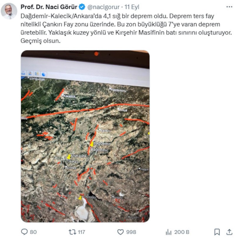 Yer bilimci Prof. Dr. Naci Görür yaşanan depremlerin ardından sosyal medya platformu X hesabı üzerinden yaptığı açıklamalar ile dikkat çekerken Ankara’da meydana gelen depremin ardından "Bu zon büyüklüğü 7’ye varan deprem üretebilir" uyarısında bulunarak endişe yarattı.