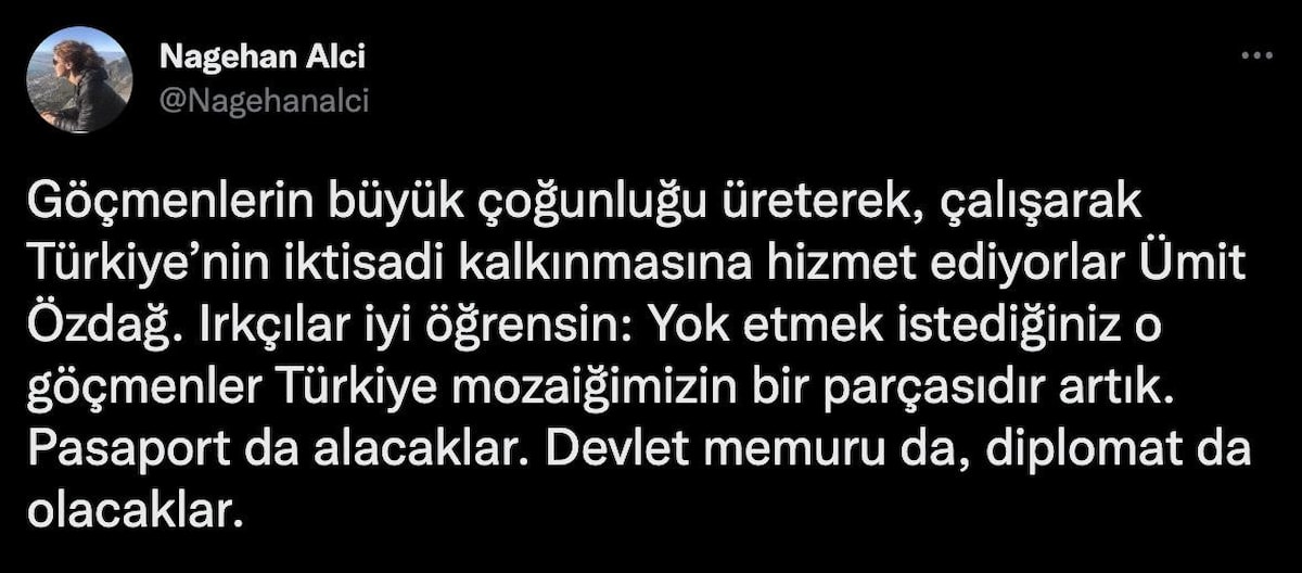 "Göçmenlerin büyük çoğunluğu üreterek, çalışarak Türkiye’nin iktisadi kalkınmasına hizmet ediyorlar Ümit Özdağ. Irkçılar iyi öğrensin: Yok etmek istediğiniz o göçmenler Türkiye mozaiğimizin bir parçasıdır artık. Pasaport da alacaklar. Devlet memuru da, diplomat da olacaklar."
