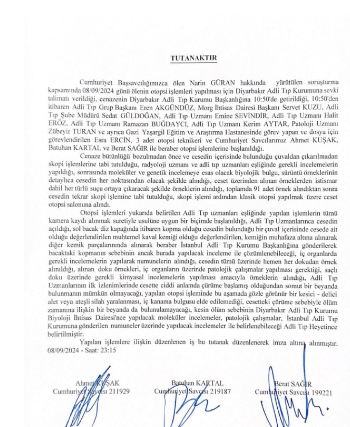 "Cumhuriyet Başsavcılığımızca ölen Narin GÜRAN hakkında yürütülen soruşturma kapsamında 08/09/2024 günü ölenin otopsi işlemleri yapılması için Diyarbakır Adli Tıp Kurumuna sevki talimatı verildiği, cenazenin Diyarbakır Adli Tıp Kurumu Başkanlığına 10.50'de getirildiği, 10.50'den itibaren Adli Tıp Grup Başkanı Eren AKGÜNDÜZ, Morg Ihtisas Dairesi Başkanı Servet KUZU, Adli Tip Şube Müdürü Sedat GÜLDOGAN, Adli Tip Uzmanı Emine SEVINDIR, Adli Tip Uzmanı Halit ERÖZ, Adli Tip Uzmanı Ramazan BUĞDAYCI, Adli Tip Uzmanı Kerim AYTAR, Patoloji Uzmanı Zübeyir TURAN ve ayrıca Gazi Yaşargil Eğitim ve Araştırma Hastanesinde görev yapan ve dosya için görevlendirilen Esra ERCIN, 3 adet otopsi teknikeri ve Cumhuriyet Savcılarımız Ahmet KUŞAK. Batuhan KARTAL ve Berat SAGIR ile beraber otopsi işlemlerine başlanıldığı.